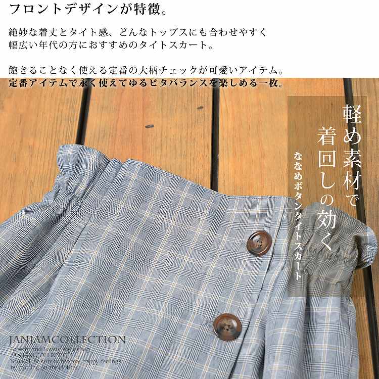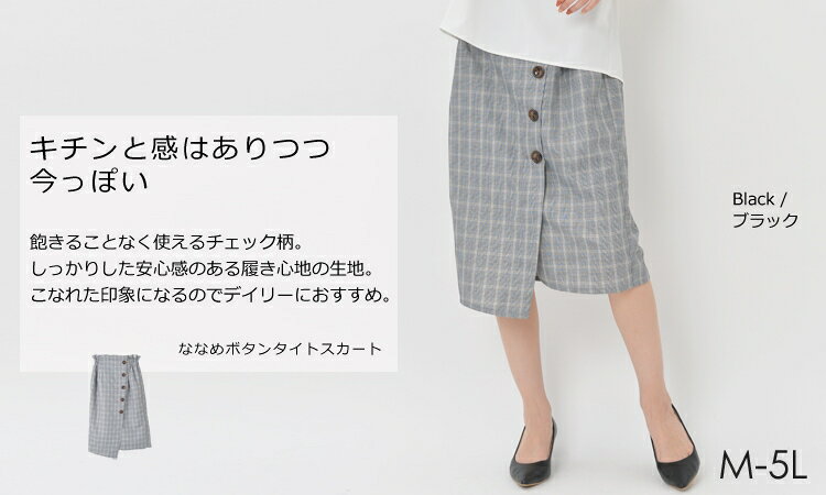 大きいサイズ レディース ボトムス タイトスカート グレンチェック柄 ななめボタン ミモレ丈 アシンメトリー M LL 3L 4L 5L 9号 13号 15号 17号 19号 pm-ssa-bt0344スタイリングの華やかなアクセントにも映えるななめボタン使いのタイトスカート。