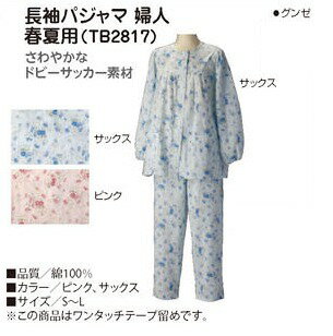 商品情報 ●メーカー グンゼ●サイズ SML●品質 綿100%●カラー サックスピンク●その他 婦人用【長袖パジャマ 婦人 春夏用】 S/M/L グンゼ パジャマ 介護/介護用品/福祉用具/綿100%/春/夏/女性/プレゼント/ワンタッチテープ/制菌/消臭/衛生的/さわやか/ドビーサッカー素材/ ★