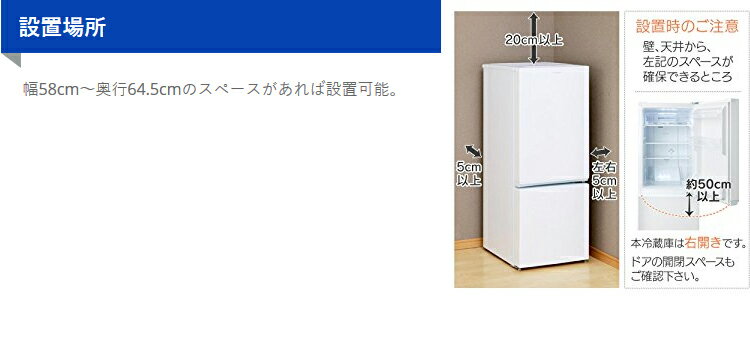 ■冷凍室の性能記号:フォースター冷凍負担温度(食品温度):-18℃以下冷凍食品の保存期間の目安:約3ヶ月■定格電圧AC100V■定格電源周波数50/60Hz■定格消費電力電動機:52/60W電熱装置:105W■年間消費電力量300kWh/年■商品サイズ(cm)幅約48×奥行約59.5×高さ約126.6■商品重量約45kg■電源コード長さ1.9mコンパクトなのにしっかり保存☆